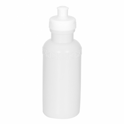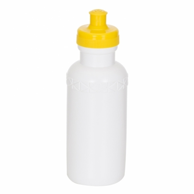 Squeeze 500ml plástico livre de BPA, possui corpo branco com tampa colorida e detalhe em relevo na parte superior. Tampa rosqueável com bico de silicone.