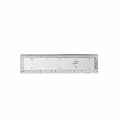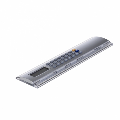 Régua calculadora plástica 20cm. Calculadora de 8 dígitos com base prata, possui as medidas cm e polegada nas laterais plásticas transparentes. Impressão serigráfica.