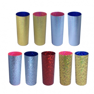Copo long drink 330ml, material plástico, cores metalizadas. Impressão serigráfica
