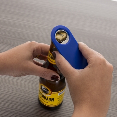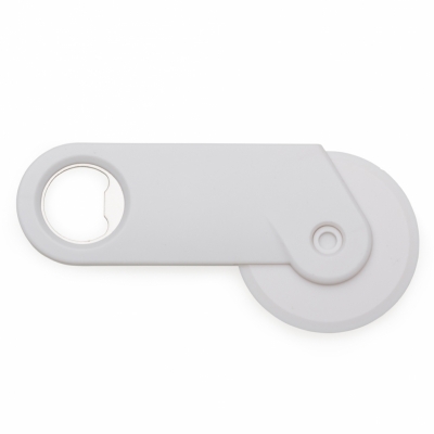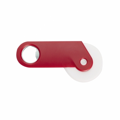 Cortador de pizza e abridor de garrafas em plástico resistente. Cortador branco e corpo colorido, possui abridor prata no parte inferior. Impressão Serigráfica 1 cor.