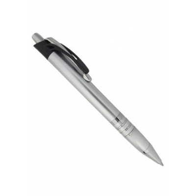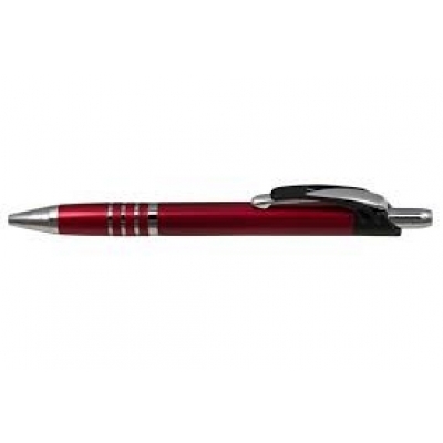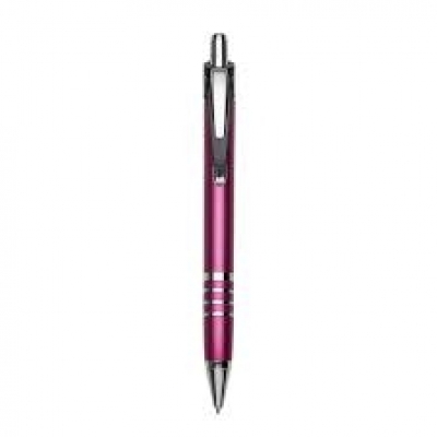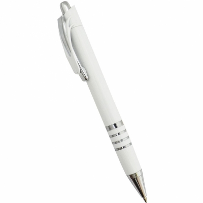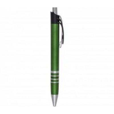 Caneta plástica inteira colorida com detalhes prata. Possui clip de metal com detalhe plástico preto, parte inferior com três anéis coloridos. Aciona por clique.