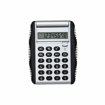 Calculadora plástica de 8 dígitos com bordas emborrachadas em relevo. Possui compartimento flexível, basta puxar "botão" para baixo que a tampa protetora irá levantar e servirá de apoio, acompanha uma bateria AG10.