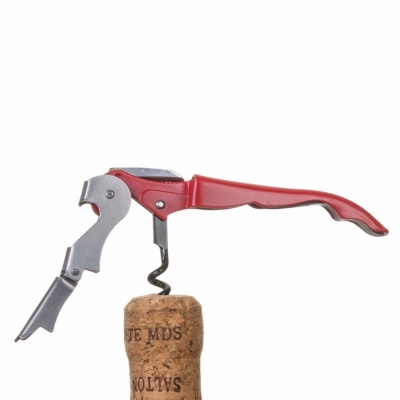 Saca rolha de metal com detalhes coloridos, também possui lâmina de corte.