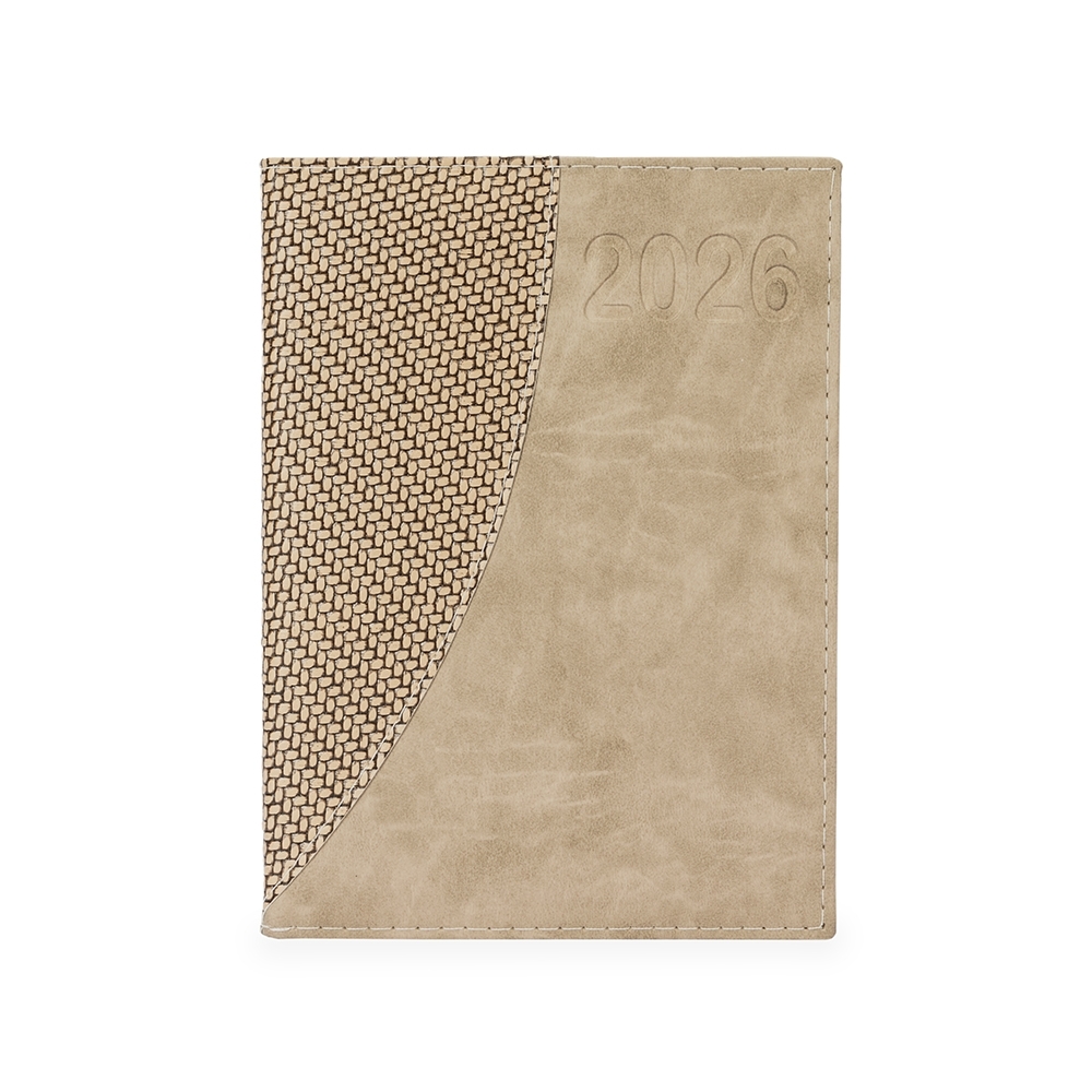 Agenda diária 2026 de couro sintético. Contém fita de cetim marca página, dados pessoais, mapa do Brasil, mapa-múndi, índice telefônico e planejamento.
