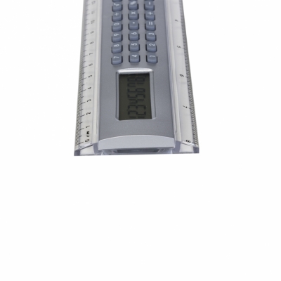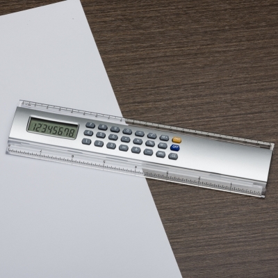 Régua calculadora plástica 20cm. Calculadora de 8 dígitos com base prata, possui as medidas cm e polegada nas laterais plásticas transparentes. Impressão serigráfica.