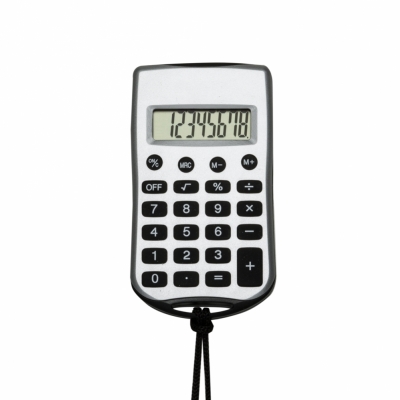 Calculadora plástica retangular de 8 dígitos prata com cordão e acessórios coloridos, necessita de 1 bateria AG10 para funcionamento(acompanha). Impressão Serigráfica.