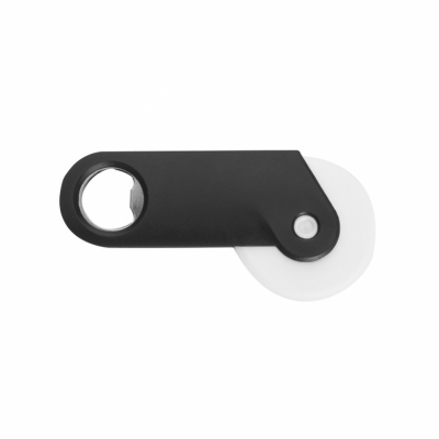 Cortador de pizza e abridor de garrafas em plástico resistente. Cortador branco e corpo colorido, possui abridor prata no parte inferior. Impressão Serigráfica 1 cor.