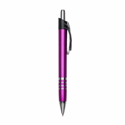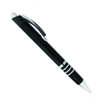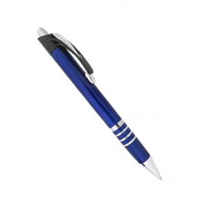 Caneta plástica inteira colorida com detalhes prata. Possui clip de metal com detalhe plástico preto, parte inferior com três anéis coloridos. Aciona por clique.