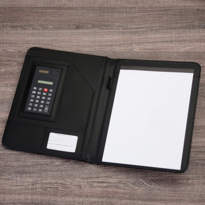Pasta convenção de couro sintético, possui calculadora solar plástica de 8 dígitos, suporte para cartão, suporte com visor para cartão de identificação, suporte para arquivar documentos, suporte para caneta(não acompanha caneta) e bloco com 20 folhas pautadas.