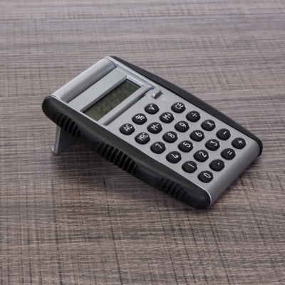 Calculadora plástica de 8 dígitos com bordas emborrachadas em relevo. Possui compartimento flexível, basta puxar "botão" para baixo que a tampa protetora irá levantar e servirá de apoio, acompanha uma bateria AG10.