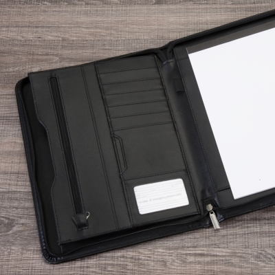 Pasta convenção de couro sintético com zíper, possui 2 compartimentos grandes para arquivar documentos, compartimento interno com zíper, 7 divisórias pequenas para documentos, suporte com visor para cartão de identificação, suporte para caneta(não acompanha caneta) e bloco com 20 folhas pautadas.