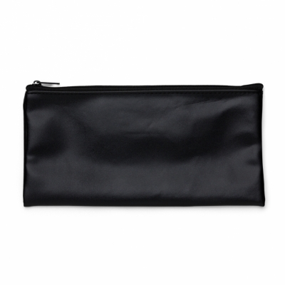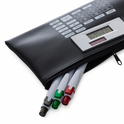 Carteira couro sintético com calculadora solar de 8 dígitos. Carteira preta com detalhes prata na calculadora e botões impressos na capa em branco, possui zíper.