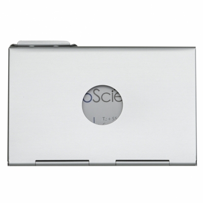 Porta cartão de alumínio, design da abertura em diagonal e com um furo central vazado na parte traseira.