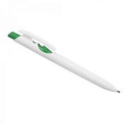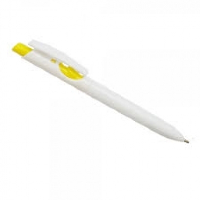 Caneta plástica branca com detalhes no acionador e destravador colorido.