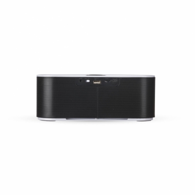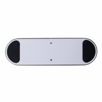 Caixa de Som Multimídia. Design fino e material plástico resistente, possui: botão On/Off no verso, botão >|| (MODE), botão < retroceder faixa ou diminuir volume, botão > avançar faixa ou aumentar volume, botão PLAY/PAUSE e atender chamadas, entrada P2/auxiliar(caixinha de som pode ser conectada no computador, basta segurar o botão central para alternar o modo), entrada microUSB, microfone, entrada microSD(cartão de memória) e entrada USB(leitura de pen drive), parte inferior possui borrachas anti deslizantes e auto-falantes laterais. Acompanha cabo USB.