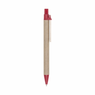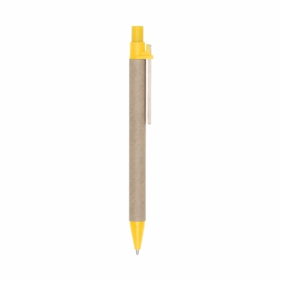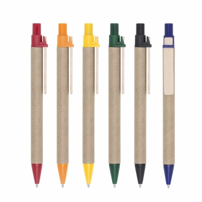 Caneta ecológica de papelão com detalhes coloridos. Clip de madeira e