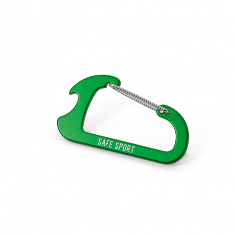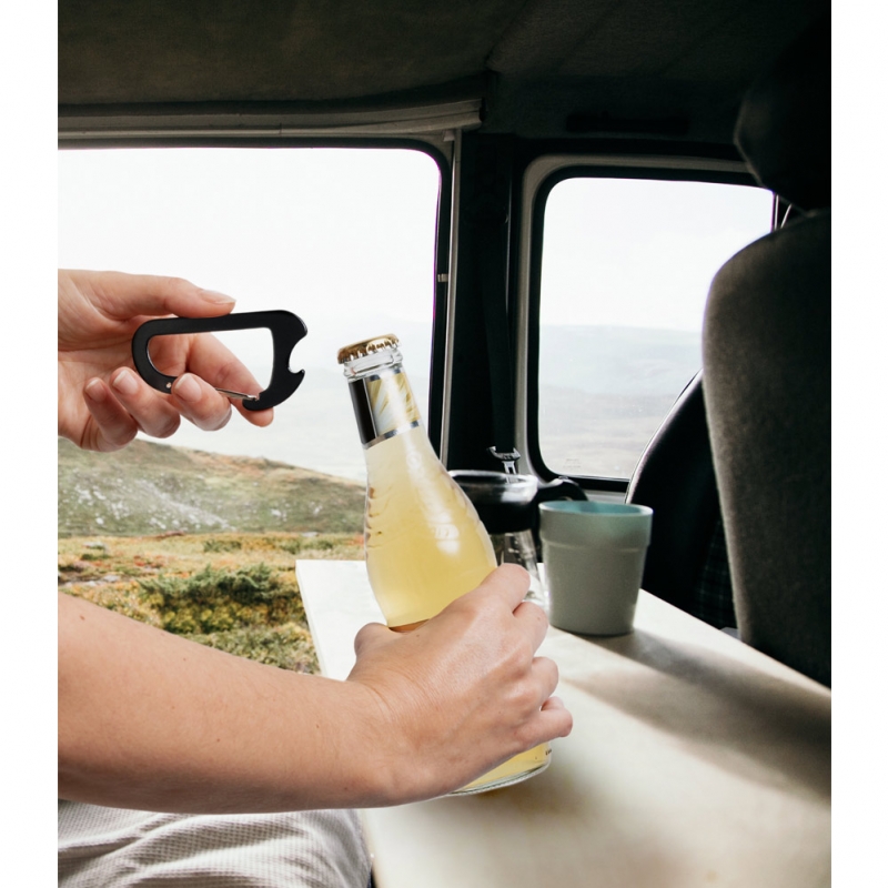 Mosquetão em alumínio com abridor de garrafas. Não adequado para escalada esportiva. 44 x 79 x 3 mm